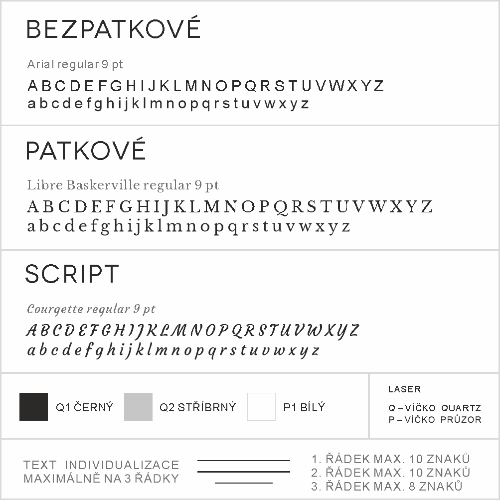 3. Služby: Vyberte font pro texty a monogram. Vyberte technologii pro individualizaci dýnka a vnitřní strany skla. Máte-li vlastní návrhy nebo texty pro průzor a vnitřní stranu skla, nahrajte je.